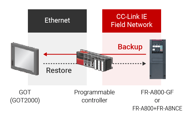 Also, backup/restore Inverter parameters, etc. can be backed up to GOT (Graphic Operation Terminal).