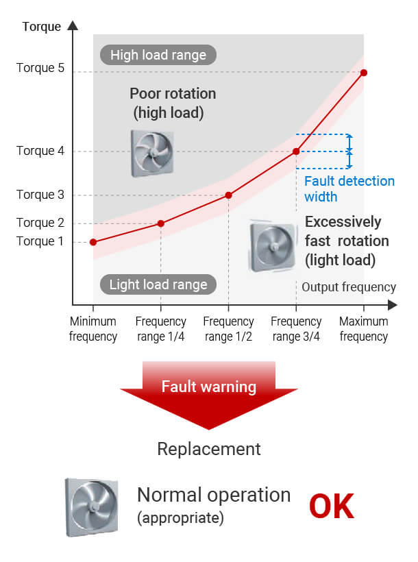 Power consumption can be reduced by adjusting the amount of airflow by controlling the rotation frequency inverter. Further energy savings can also be achieved with IE3 and IE4 compatible general-purpose motors (IM) and PM motors (PM) that incorporate permanent magnets into the rotors.