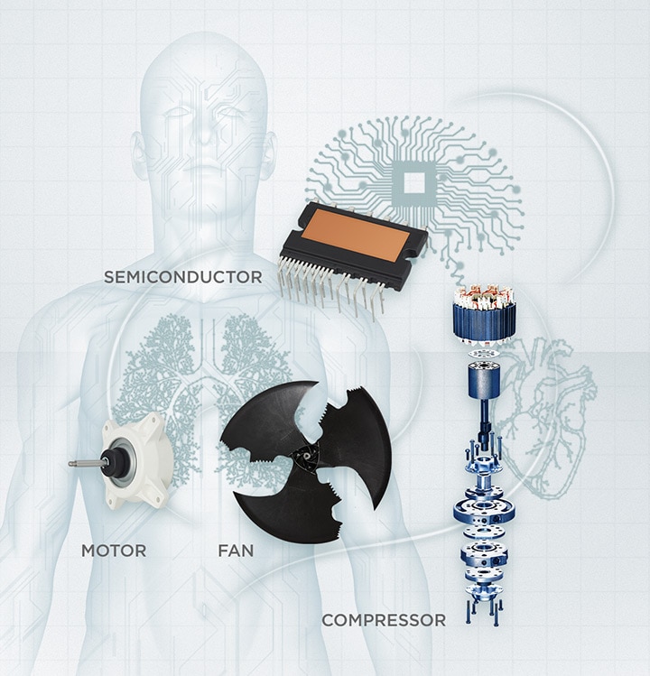 In the same way that the heart, brain, and lungs work together, so the compressor, semiconductor, and fan of an air conditioner play essential roles and must work in harmony. At Mitsubishi Electric, key parts are manufactured in-house. Why? The only way to guarantee the best quality is by taking full control of the core components.